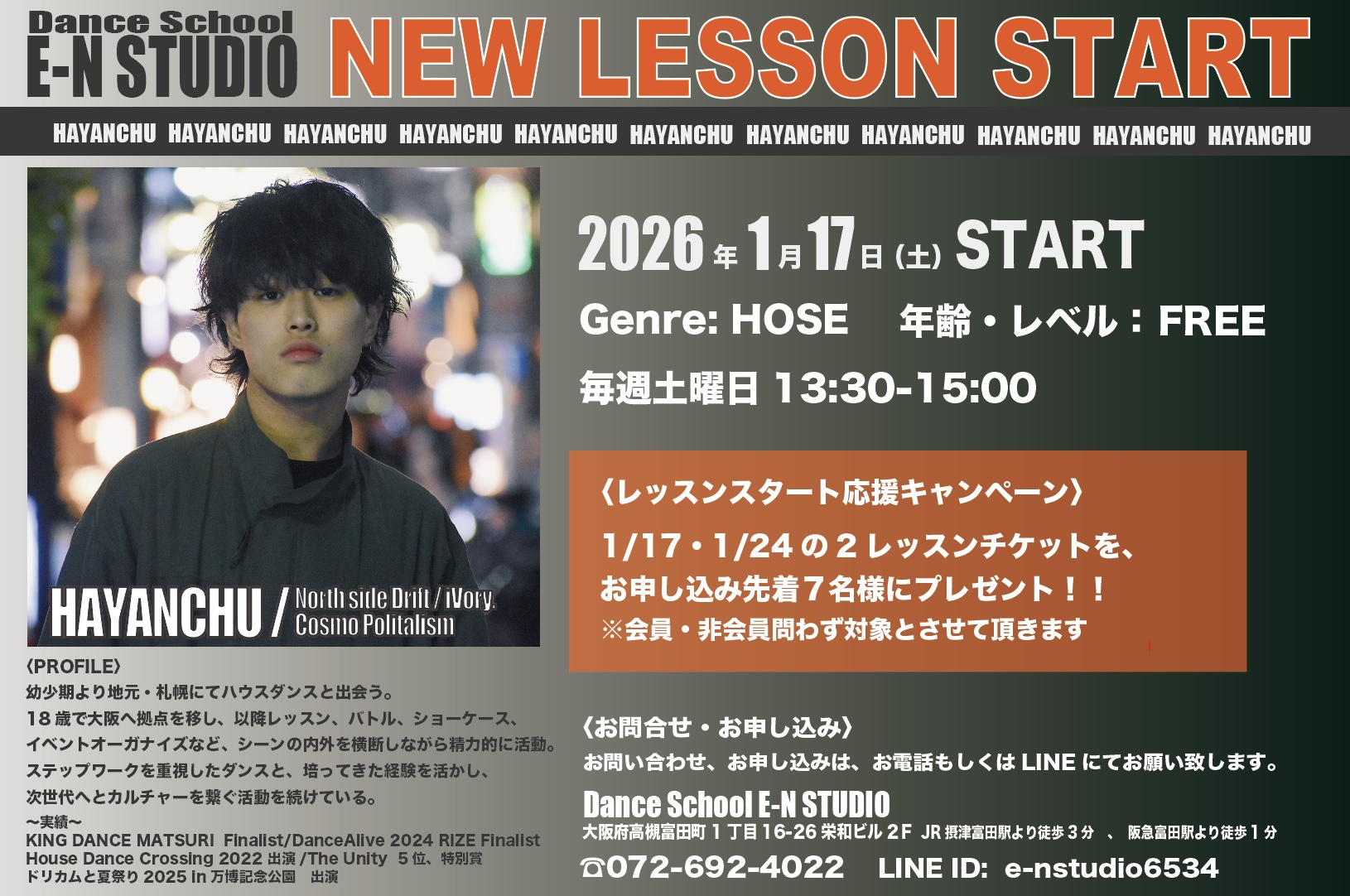 幼少期より地元・札幌にてハウスダンスと出会う。18歳で大阪へ拠点を移し、以降レッスン、バトル、ショーケース、イベントオーガナイズなど、シーンの内外を横断しながら精力的に活動。ステップワークを重視したダンスと、培ってきた経験を活かし、次世代へとカルチャーを繋ぐ活動を続けている。